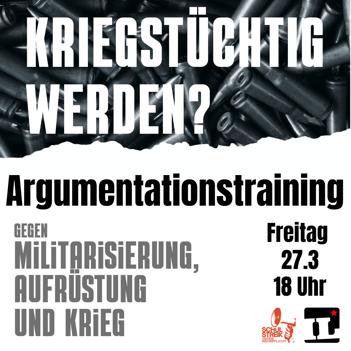 Viele sind damit nicht einverstanden – und gleichzeitig unsicher, wie der Mobilmachung im Alltag, in der Familie oder im Freund*innenkreis etwas entgegengesetzt werden kann. In unserem Argumentationstraining wollen wir gemeinsam erarbeiten, welche Postitionen zu Krieg, Aufrüstung und Militarisierung es gibt, welche Argumente helfen, und wie wir Menschen von einer antimilitaristischen Postition überzeugen können – ohne dass dabei die eigenen Ängste, Unsicherheiten und Fragezeichen unter den Tisch fallen müssen.